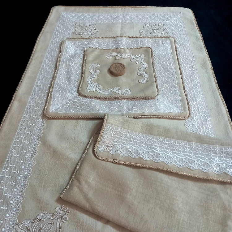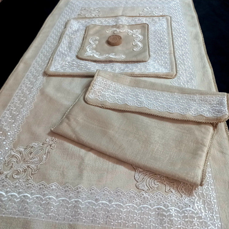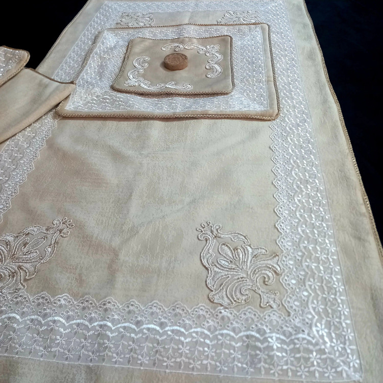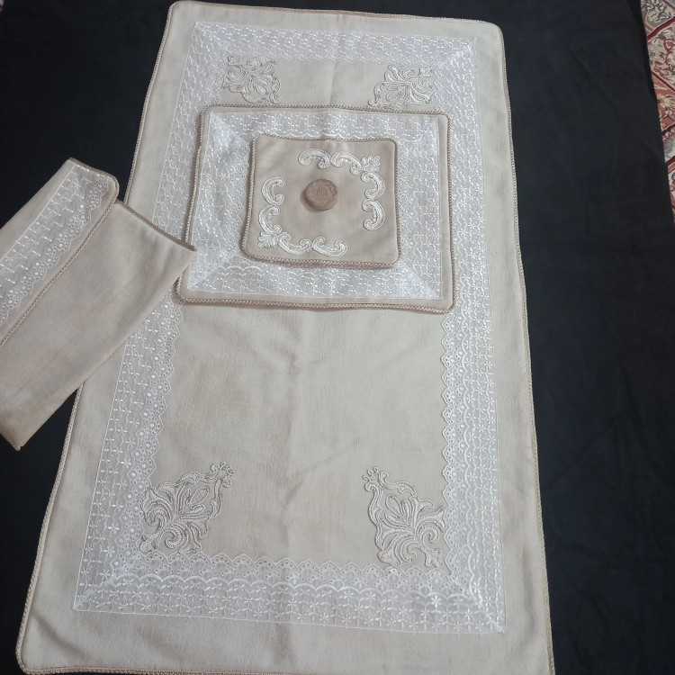 ست چهار تکه سجاده و جانماز و کیف قابل حمل .این ست با حاشیه تور تزئین شده تماما دوخته و دارای استری مقاوم و تمیزدوزی و نوار مغزی شده است.کیف اون هم کاملا مغزی دوزی شده .سجاده به راحتی داخل کیف جا میشه و به هر کجا میتونی اون و با خودت ببری .