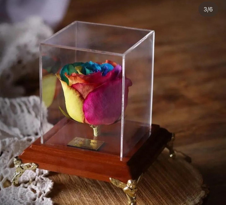 گل رز ی که تعبیه شده کاملا طبیعیه و لی زنده نیست و مومیایی شده که با ماندگاری طولانی مدت تا 5سال براتون بمونه دوراز افتاب و رطوبت باشه.و لمس نشه.جعبه اون باز میشه و میتونین شکلات یا اشیا زینتی داخلش بزارین.
