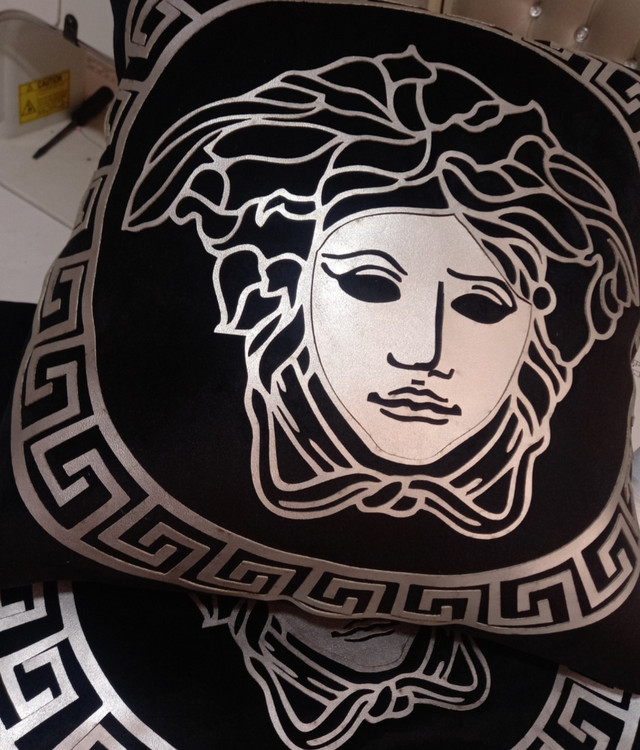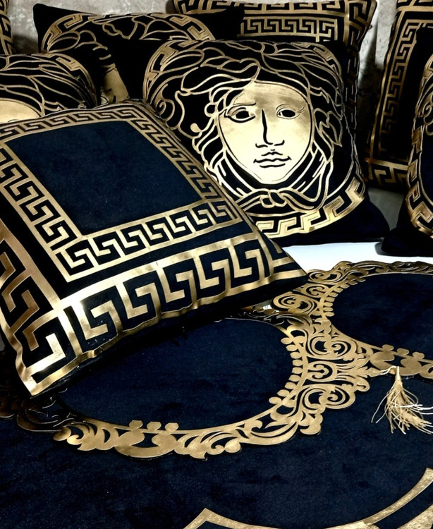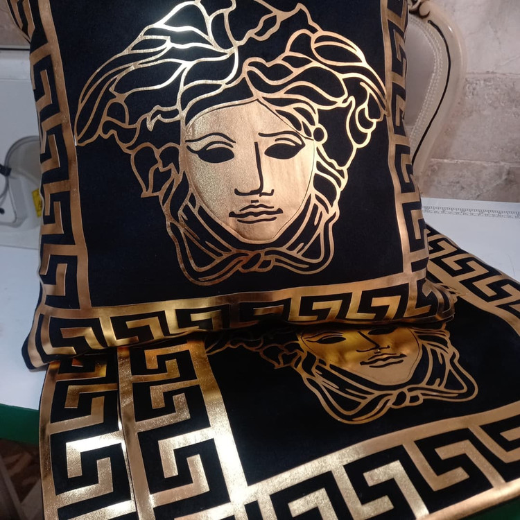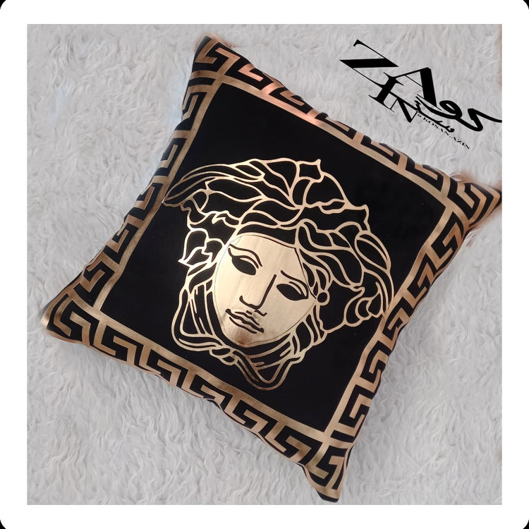 کوسن ورساچه دوخته شده با پارچه مخمل دوبل و چرم با کیفیت رویه ست .این کار معروف به طرح ورساچه ست.چرم رو میتونین به سه رنگ طلایی و نقره ای و مشکی سفارش بدین.پارچه هم رنگبندی داره میتونی طبق سلیقه نودت و دکور خونت رنگ و عوض کنی .