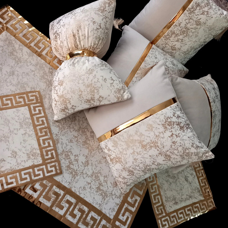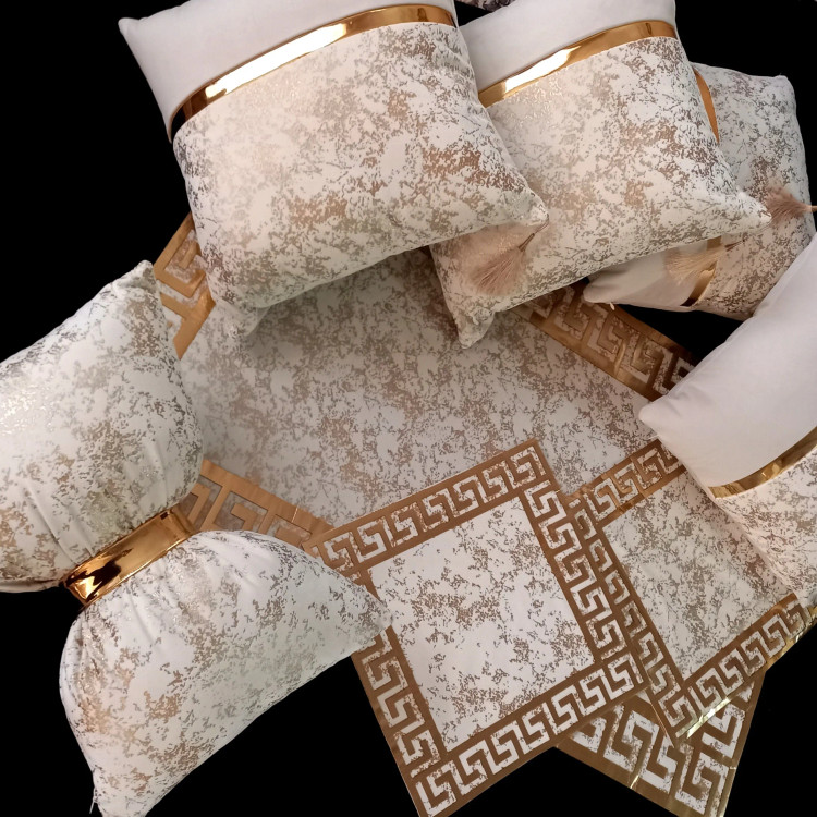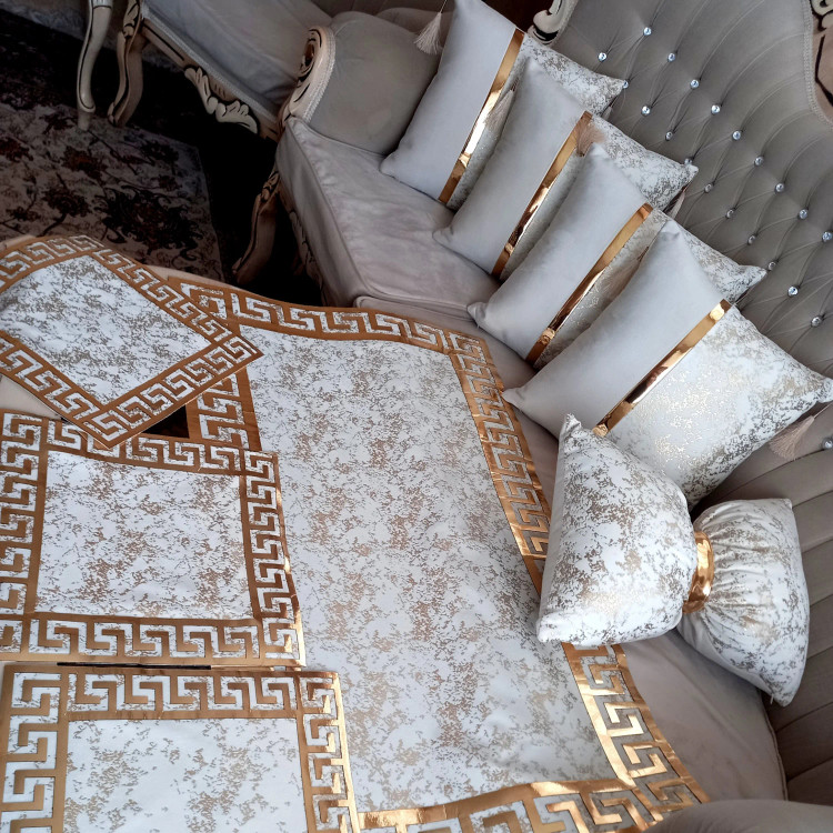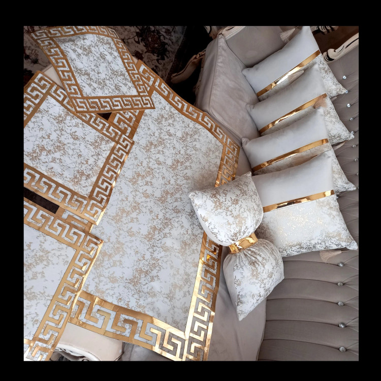 تمامی کارهای برند آذین از کیفیت پارچه و چرم برخورداره.منگوله در صورت نمایل اضافه میشه.این ست شامل ۴عدد کاور کوسن مربع یک عدد پاپیون وست سه تیکه رومیزی میباشد